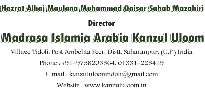 » Hazrat Moulana Hakim Abdur Rasheed Mahmood (Nannu Mian) Sb. Gangohi Rh. » Hazrat Moulana Zahid Hasan Sb. Ibrahimi Rh. (Sadar Jamiat Ulama Distt. Saharanpur) » Hazrat Alhaj Hafiz Abdus Sattar Sb. Nankavi Rh. (Khalifa Hazrat Raipuri Rh.) » Hazrat Moulana Sayyed Asad Madani Sb Rh. (Sadar Jamiat Ulama Hind) » Hazrat Moulana Mufti Muzaffar Hussain Sb. Rh. (Nazim-e-Alaa Mazahirul Uloom Waqf Saharanpur) » Hazrat Moulana Mohammadullah Sb. Rh. (Nazim Mazahir Uloom Saharanpur) » Hazrat Moulana Allama Rafique Ahmad Sb. Bhaisani Rh. (Sabiq Shaikhul Hadith Miftahul Uloom Jalalabad)